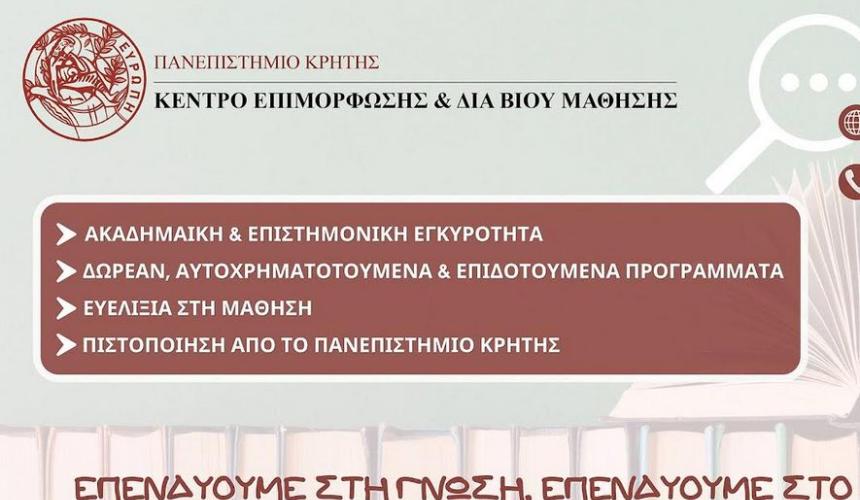 Το Κέντρο Επιμόρφωσης και Διά Βίου Μάθησης (ΚΕ.ΔΙ.ΒΙ.Μ.) του Πανεπιστημίου Κρήτης, δέχεται αιτήσεις στα παρακάτω επιμορφωτικά προγράμματα: