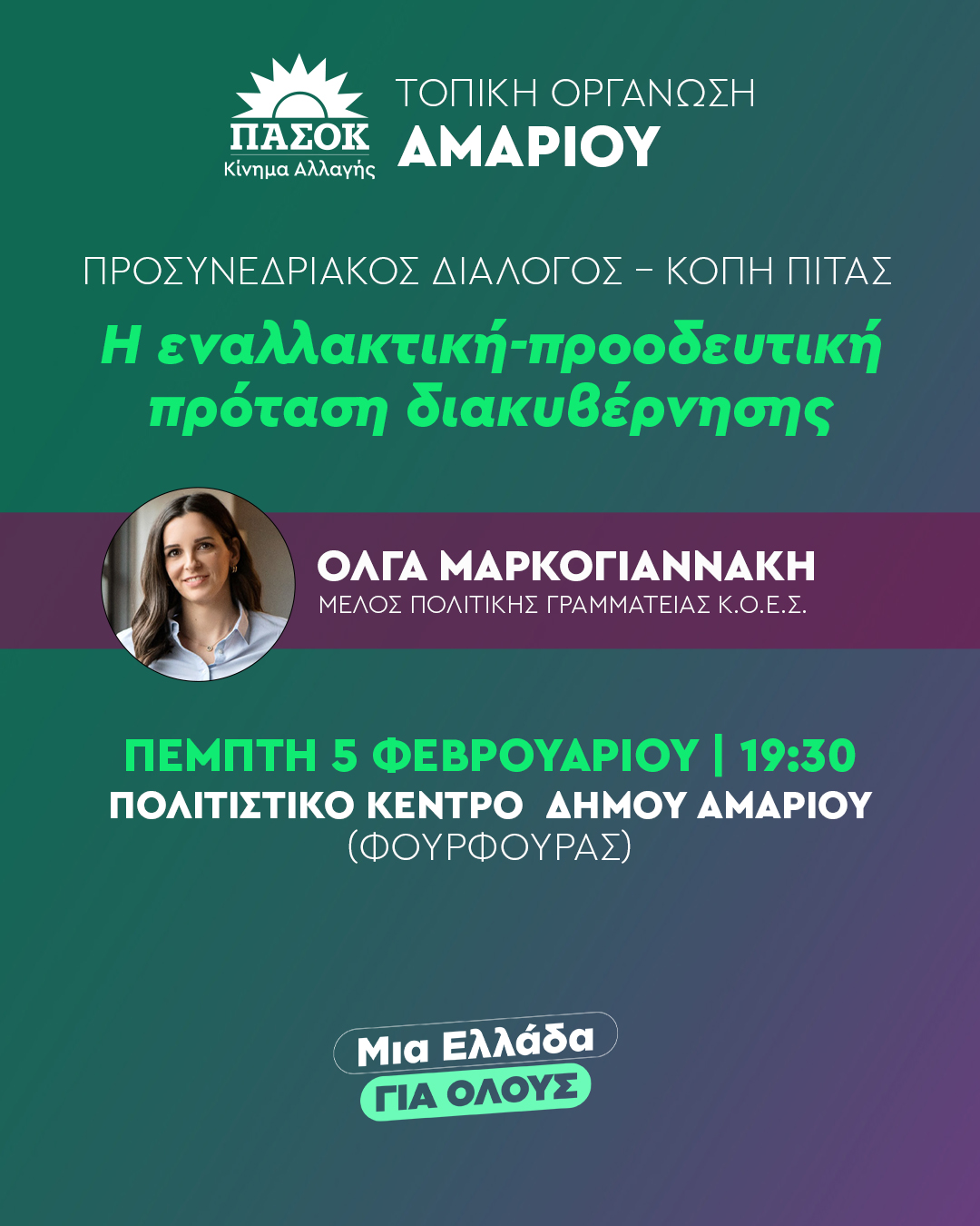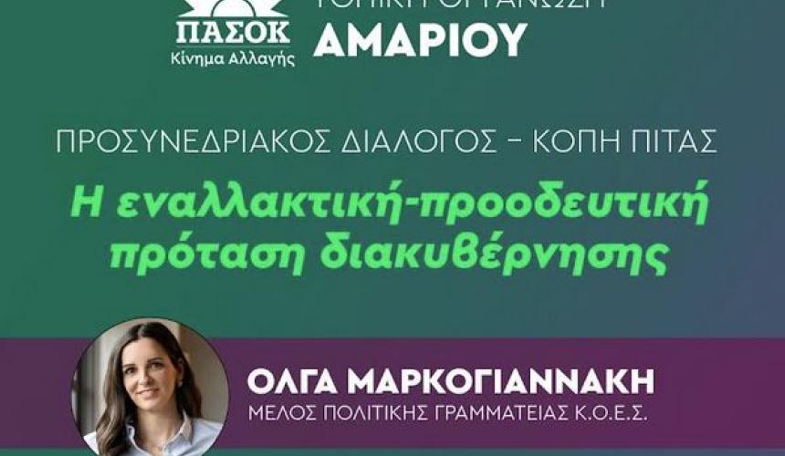 Η Τοπική Οργάνωση Αμαρίου του ΠΑΣΟΚ – Κινήματος Αλλαγής διοργανώνει την Πέμπτη 5 Φεβρουαρίου 2026 και ώρα 19:30, στο Πολιτιστικό Κέντρο Δήμου Αμαρίου (Φουρφουράς), εκδήλωση στο πλαίσιο του προσυνεδριακού διαλόγου, η οποία θα πλαισιωθεί και από την καθιερωμένη κοπή της πρωτοχρονιάτικης πίτας.