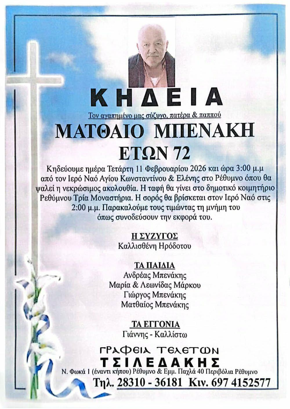 Το τελευταίο αντίο θα ειπωθεί στις 3μμ από τον Ι.Ν. Αγίων Κωνσταντίνου και Ελένης στην πόλη του Ρεθύμνου.