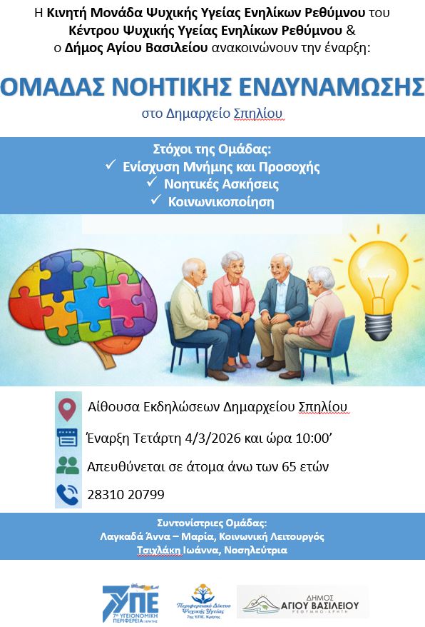 Η έναρξη της ομάδας νοητικής ενδυνάμωσης θα γίνει την Τετάρτη 4/3/2026 και ώρα 10:00’ στην Αίθουσα Εκδηλώσεων του Δημαρχείου Σπηλίου, για πληροφορίες και δηλώσεις συμμετοχής μπορείτε να επικοινωνήσετε με το 2831020799.