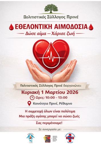 Ο Πολιτιστικός Σύλλογος Πρινέ σε συνεργασία με τον Σύλλογο Εθελοντών Αιμοδοτών Ν. Ρεθύμνου ΔΟΤΕΣ ΖΩΗΣ διοργανώνει Εθελοντική Αιμοδοσία την Κυριακή 1 Μαρτίου 2026, από τις 10:00 έως τις 13:00, στον χώρο της Κοινότητας Πρινέ Ρεθύμνου.