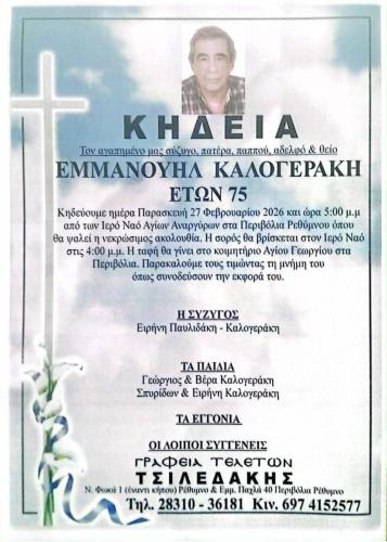 Με θλίψη σας ενημερώνουμε για την απώλεια του Εμμανουήλ Καλογεράκη, εκλεκτού συναδέλφου Πολιτικού Μηχανικού.