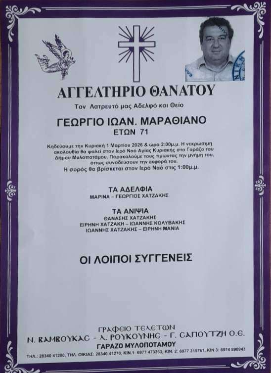 "Με βαθιά θλίψη και ειλικρινή συγκίνηση, αποχαιρετούμε τον Γεώργιο Ιωαν. Μαραθιανό, έναν άνθρωπο που ταύτισε τη διαδρομή του με την προσφορά στο Γαράζο Μυλοποτάμου.