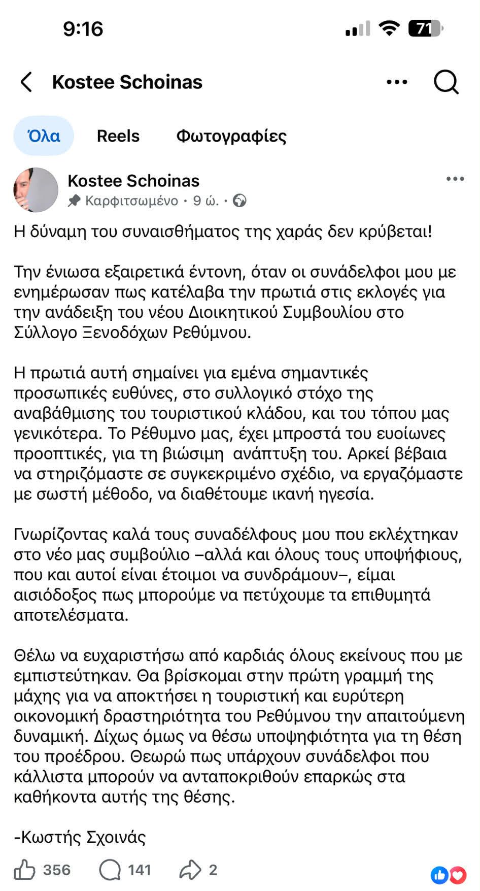 Θέλω να ευχαριστήσω από καρδιάς όλους εκείνους που με εμπιστεύτηκαν. Θα βρίσκομαι στην πρώτη γραμμή της μάχης για να αποκτήσει η τουριστική και ευρύτερη οικονομική δραστηριότητα του Ρεθύμνου την απαιτούμενη δυναμική. Δίχως όμως να θέσω υποψηφιότητα για τη θέση του προέδρου. Θεωρώ πως υπάρχουν συνάδελφοι που κάλλιστα μπορούν να ανταποκριθούν επαρκώς στα καθήκοντα αυτής της θέσης.