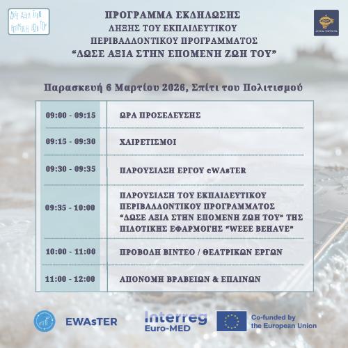 Η εκδήλωση θα πραγματοποιηθεί την Παρασκευή, 6 Μαρτίου του 2026 από τις 09:00 έως τις 12:00 στο «Σπίτι του Πολιτισμού» και περιλαμβάνει τέσσερις ενότητες: την παρουσίαση του έργου e-WAsTER , την παρουσίαση του Εκπαιδευτικού Περιβαλλοντικού Προγράμματος «Δώσε αξία στην επόμενη ζωή του» της πιλοτικής εφαρμογής «WEEE BEHAVE», την προβολή βίντεο και θεατρικών έργων που δημιούργησαν οι μαθητές των Δημοτικών Σχολείων και τις απονομές των βραβείων και των επαίνων για τις διαγωνιστικές δράσεις του Προγράμματος.