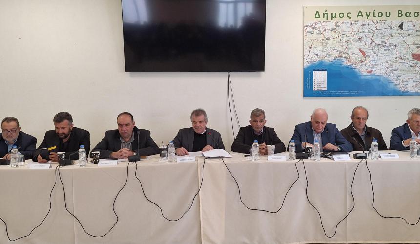 Η σύσκεψη για τον ΝΟΑΚ πραγματοποιήθηκε στο Δημαρχείο Αγίου Βασιλείου στο Σπήλι με την συμμετοχή των Δημάρχων της νότιας Κρήτης και αντικείμενο τη διαμόρφωση ενιαίας πρότασης για τη σύγχρονη και ασφαλή οδική σύνδεση των νότιων Δήμων με το νέο διεθνές Αεροδρόμιο Καστελίου.