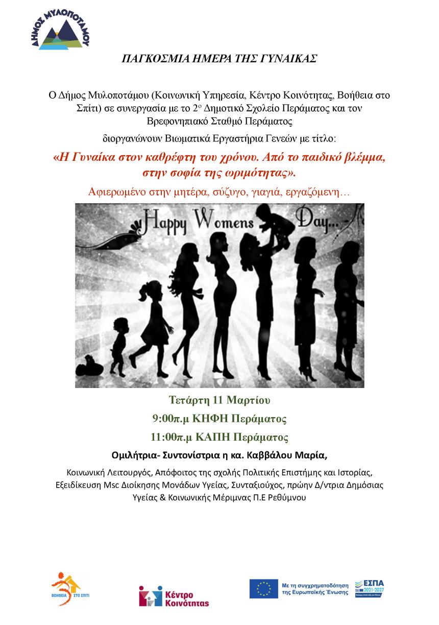 Ο Δήμος Μυλοποτάμου (Κοινωνική Υπηρεσία, Κέντρο Κοινότητας, Βοήθεια στο Σπίτι) σε συνεργασία με το 2ο Δημοτικό Σχολείο Περάματος και τον Βρεφονηπιακό Σταθμό Περάματος διοργανώνουν με αφορμή τον εορτασμό της παγκόσμιας ημέρας της γυναίκας Βιωματικά Εργαστήρια Γενεών με τίτλο: