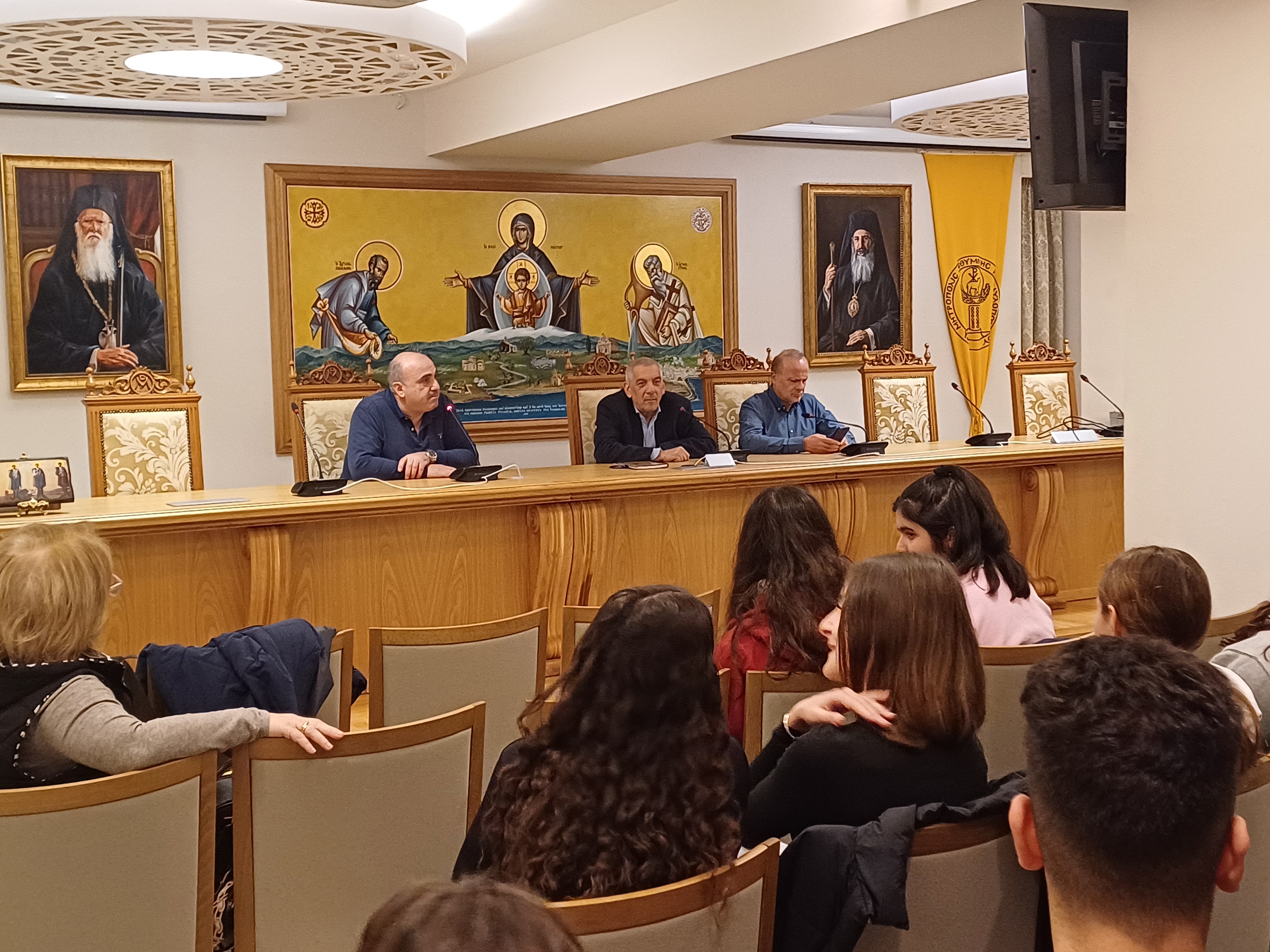 Την Πέμπτη, 26 Φεβρουαρίου 2026, οι μαθητές της Γ΄ τάξης και οι εκπαιδευτικοί του 1ου Γυμνασίου Ρεθύμνου είχαν την εξαιρετική τιμή να συναντήσουν δύο διακεκριμένες προσωπικότητες του ελληνικού αθλητισμού: τον κορυφαίο δημοσιογράφο Βασίλη Σκουντή και τον πρώην εντεταλμένο σύμβουλο αθλητισμού, νυν Αντιδημάρχο Οικονομικών Δήμου Ρεθύμνης και εν ενεργεία αθλητή Δημήτρη Λαχνιδάκη. Η εκδήλωση, πραγματοποιήθηκε στο πλαίσιο των δράσεων για την Ημέρα του Φιλάθλου, ενώ φιλοξενήθηκε στην αίθουσα «Θεομήτωρ» στο Κέντρο Πολιτισμικής και Κοινωνικής Διακονίας της Ιεράς Μητροπόλεως Ρεθύμνης και Αυλοποτάμου.