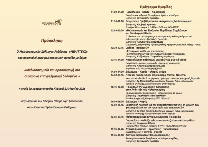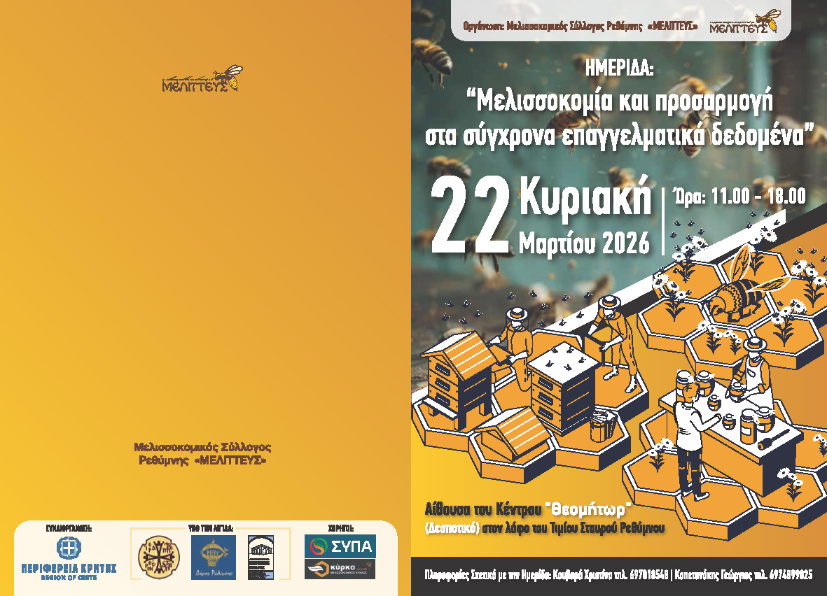 Ο Μελισσοκομικός Σύλλογος Ρεθύμνης «ΜΕΛΙΤΤΕΥΣ» προσκαλεί τα μέλη του αλλά και κάθε ενδιαφερόμενο στην ημερίδα με θέμα:
