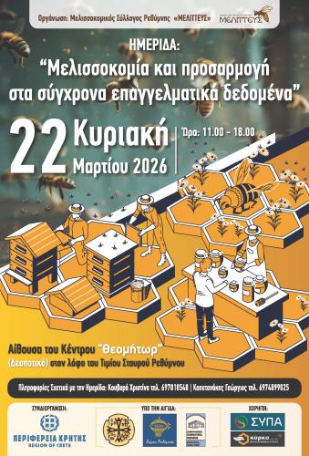 «Μελισσοκομεία και προσαρμογή στα σύγχρονα επαγγελματικά δεδομένα» η οποία θα πραγματοποιηθεί την Κυριακή 22 Μαρτίου 2026 από 11.00 έως 18.00, στην αίθουσα του Κέντρου "Θεομήτωρ" (Δεσποτικό)