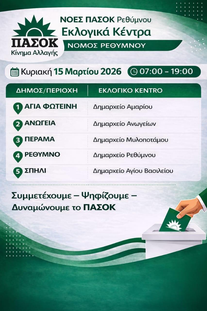 Η Νομαρχιακή Οργανωτική Επιτροπή Συνεδρίου (Ν.Ο.Ε.Σ.) ΠΑΣΟΚ – Κινήματος Αλλαγής Νομού Ρεθύμνου ενημερώνει τα μέλη και τους φίλους της παράταξης ότι την Κυριακή 15 Μαρτίου 2026, από 07:00 έως 19:00, θα πραγματοποιηθούν οι εκλογές για την ανάδειξη των συνέδρων που θα συμμετάσχουν στο 4ο Συνέδριο του ΠΑΣΟΚ – Κινήματος Αλλαγής. Δικαίωμα ψήφου έχουν τα μέλη του ΠΑΣΟΚ – Κινήματος Αλλαγής και όσοι εγγραφούν μέλη μέχρι και την ημέρα των εκλογών της 15ης Μαρτίου 2026 καταβάλλοντας αντίτιμο 2€.Για την ταυτοποίησή τους απαιτείται η επίδειξη στην εφορευτική επιτροπή αστυνομικής ταυτότητας ή διαβατηρίου ή διπλώματος οδήγησης. Ειδικά για τους νέους 16 ετών (γεννηθέντες το 2010), 17 ετών (γεννηθέντες το 2009) και τους αλλοδαπούς, που δε διαθέτουν ειδικό εκλογικό αριθμό, η ταυτοποίηση γίνεται, για τους μεν Έλληνες με ταυτότητα/διαβατήριο και ΑΜΚΑ, για τους αλλοδαπούς με άδεια παραμονής και ΑΜΚΑ και για τους Κύπριους με κυπριακή ταυτότητα και ΑΜΚΑ. Ο ΑΜΚΑ θα προκύπτει από δημόσιο έγγραφο, που θα επιδεικνύεται στην εφορευτική επιτροπή.