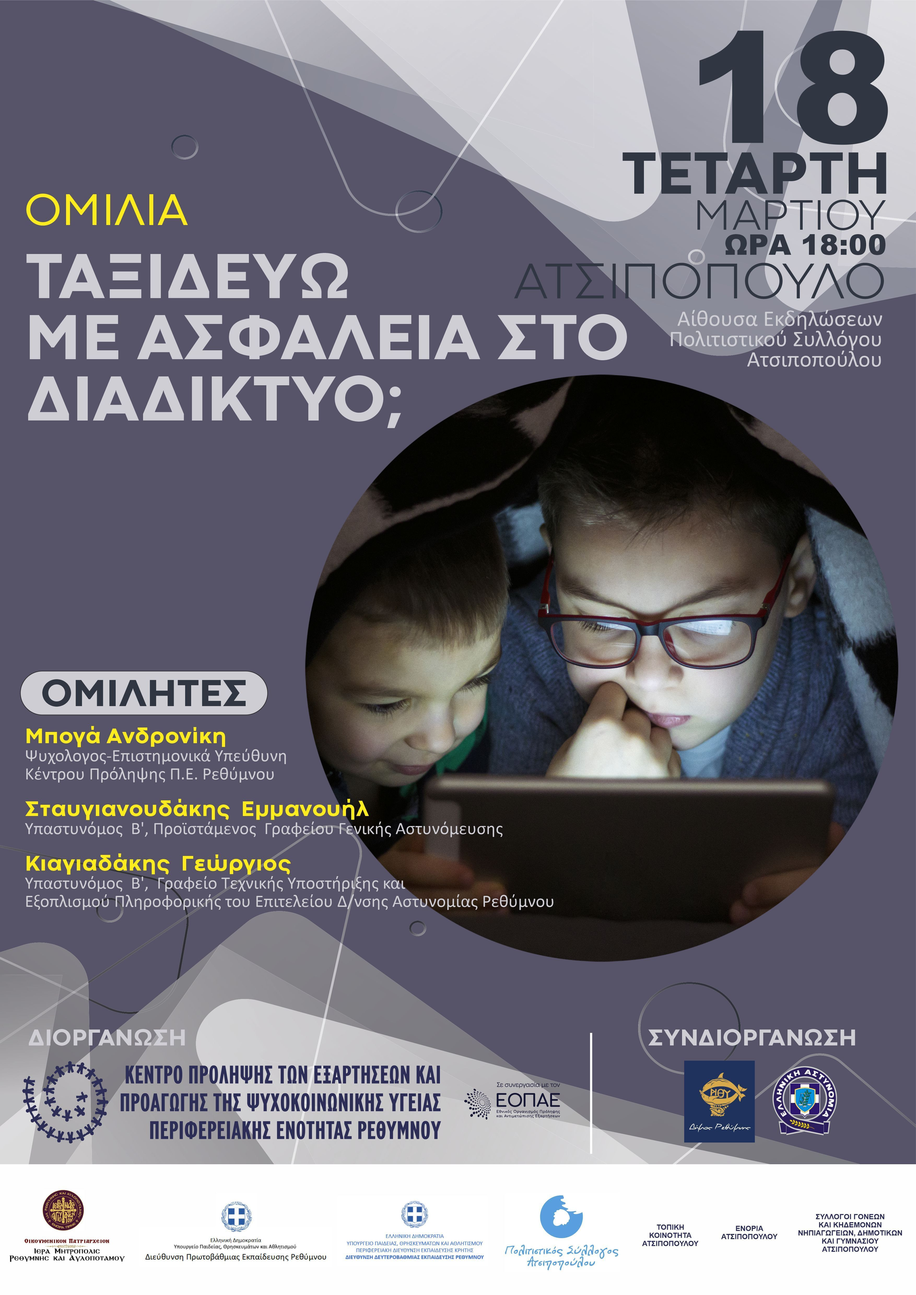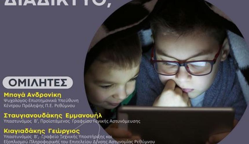Το Κέντρο Πρόληψης των Εξαρτήσεων και Προαγωγής της Ψυχοκοινωνικής Υγείας Π.Ε Ρεθύμνης, με πρωτοβουλία του προέδρου κ. Σαρρή Μιχάλη, συνεχίζει την υλοποίηση της καμπάνιας ενημέρωσης-ευαισθητοποίησης της κοινότητας με θέμα: «Ταξιδεύω με Ασφάλεια στο Διαδίκτυο;» που θα απευθύνεται σε πολίτες όλης της Περιφερειακής Ενότητας Ρεθύμνου. Συνδιοργανωτές σε αυτήν την προσπάθεια είναι η Ιερά Μητρόπολη Ρεθύμνης και Αυλοποτάμου και η Ιερά Μητρόπολη Λάμπης, Συβρίτου και Σφακίων, οι Δήμοι της Π.Ε. Ρεθύμνου, η Αστυνομική Διεύθυνση Ρεθύμνου, οι Διευθύνσεις Πρωτοβάθμιας και Δευτεροβάθμιας Εκπαίδευσης Ρεθύμνου, καθώς και οι κατά τόπους φορείς.
