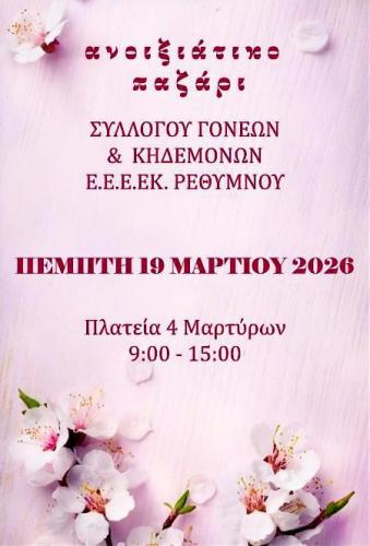 Σας περιμένουμε την Πέμπτη 19/3 στους 4 Μάρτυρες, 9πμ-3μμ, για να στηρίξετε τις δράσεις μας σε συνεργασία με το αγαπημένο μας σχολείο, τα Εργαστήρια Ειδικής Επαγγελματικής Εκπαίδευσης (Ε.Ε.Ε.ΕΚ. Ρεθύμνου)!