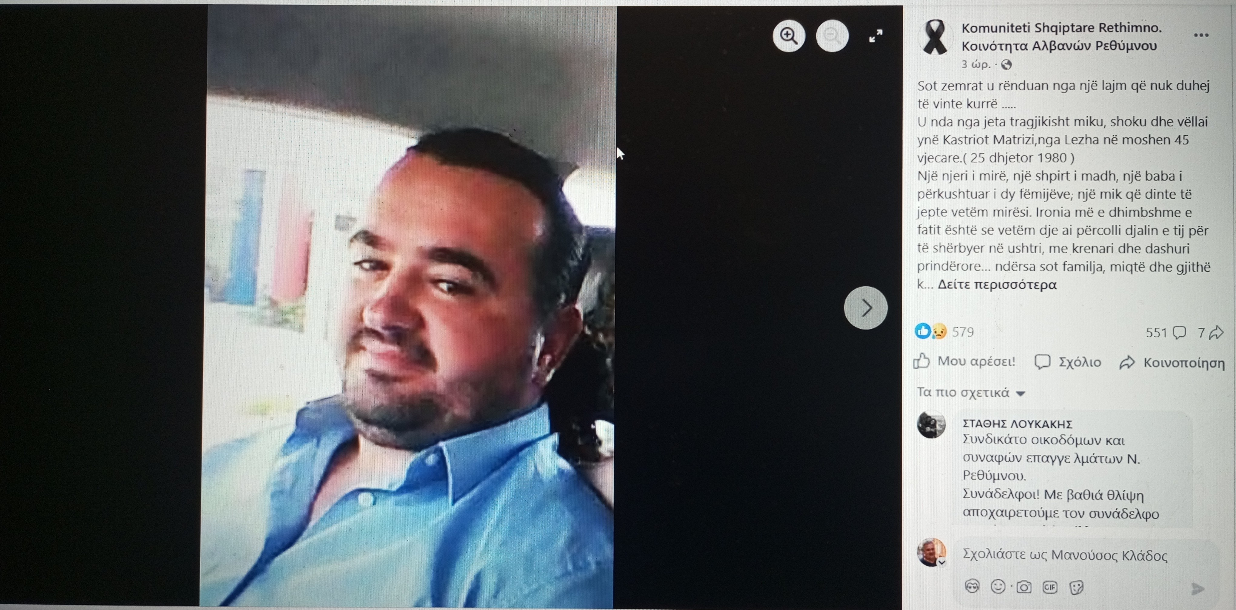 Εκφράζουμε τα πιο ειλικρινή μας συλλυπητήρια στην οικογένεια, στους φίλους του, και στην Αλβανική κοινότητα Ρεθύμνου που ήταν μέλος. Δεσμευόμαστε πως θα συνεχίσουμε τον αγώνα που και εκείνος υπηρέτησε, για δουλειά με δικαιώματα, ασφάλεια και αξιοπρέπεια.