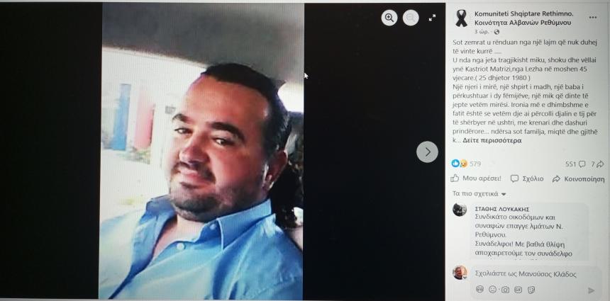 Τον 45χρονο αποχαιρετά και το Συνδικάτο Οικοδόμων Ρεθύμνου, σε σχόλιο, που ανήρτησε στα μέσα κοινωνικής δικτύωσης: