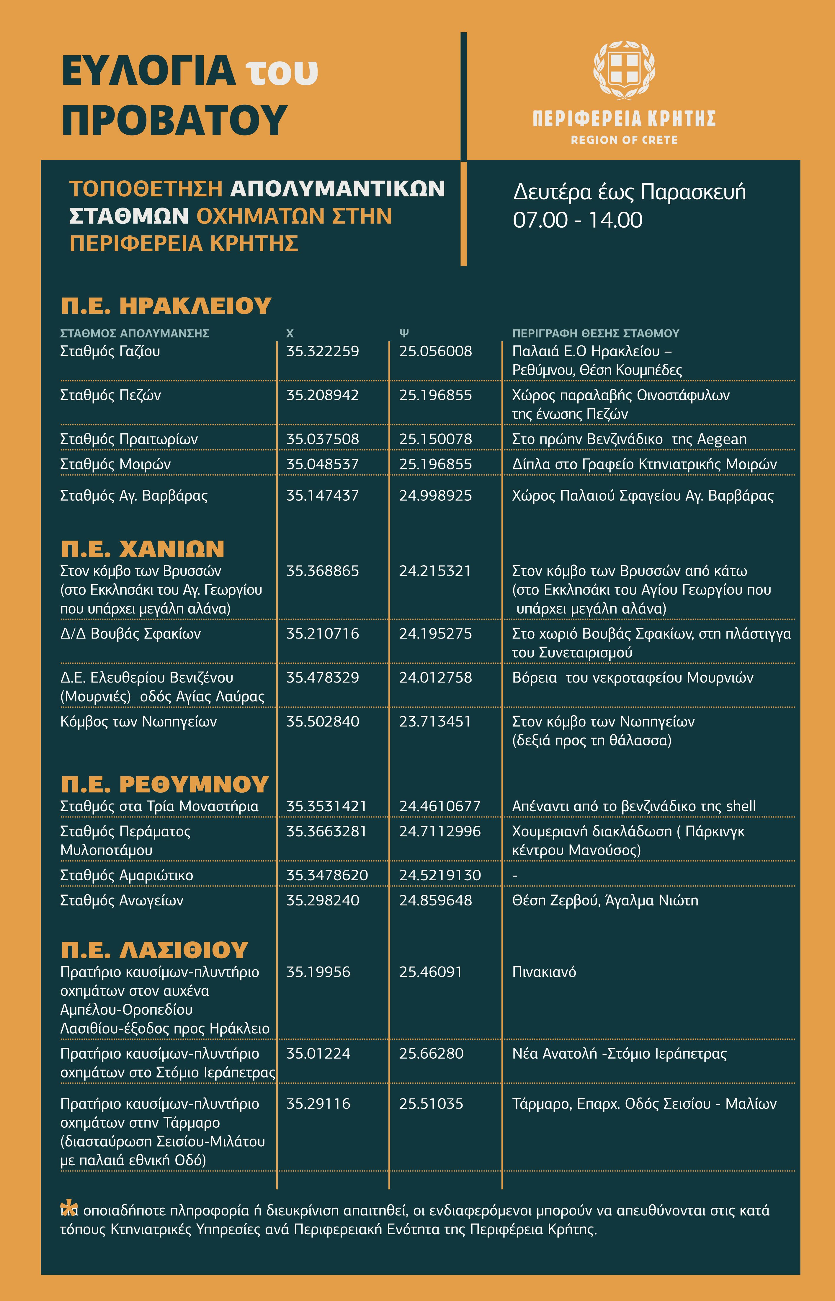 Στο πλαίσιο των έκτακτων μέτρων πρόληψης για την αποτροπή εισαγωγής και διάδοσης της νόσου της ευλογιάς του προβάτου, έχει ξεκινήσει από την Τρίτη 03-03-2026 η εγκατάσταση και λειτουργία απολυμαντικών σταθμών σε δεκαέξι (16) σημεία του οδικού δικτύου της Περιφέρειας Κρήτης, σύμφωνα με τις οδηγίες και τις συστάσεις του αρμόδιου Υπουργείου και το ισχύον θεσμικό πλαίσιο.
