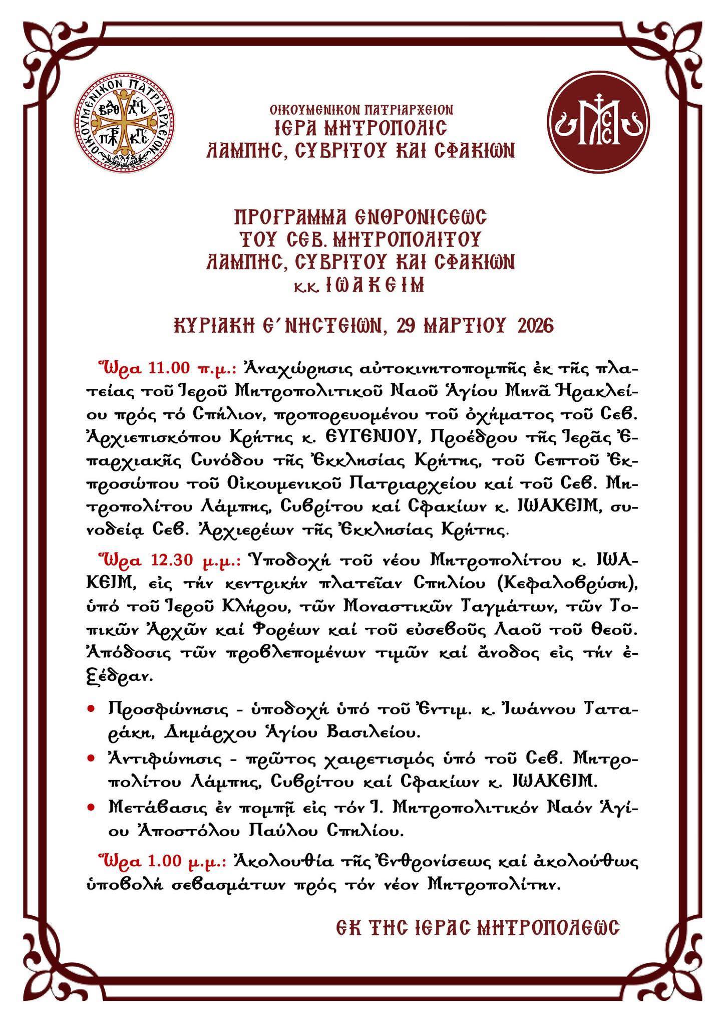 Η τελετή θα ξεκινήσει στις 12:30 στην πλατεία του Σπηλίου όπου ο Δήμαρχος Δήμου Αγίου Βασιλείου κ. Γιάννης Ταταράκης θα υποδεχθεί επίσημα τον νέο Μητροπολίτη, τον οποίο θα συνοδεύουν ο Αρχιεπίσκοπος Κρήτης κ. Ευγένιος και οι Μητροπολίτες της Εκκλησίας της Κρήτης.