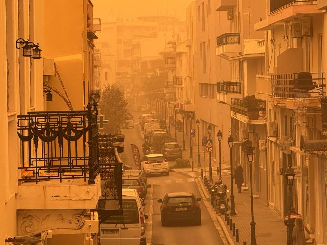 Στο Ρέθυμνο, οι εικόνες αποτυπώνουν τη μεγάλη συγκέντρωση αφρικανικής σκόνης στην ατμόσφαιρα, δημιουργώντας ένα σκηνικό που παραπέμπει σε συνθήκες ερήμου και περιορίζει αισθητά την ορατότητα.