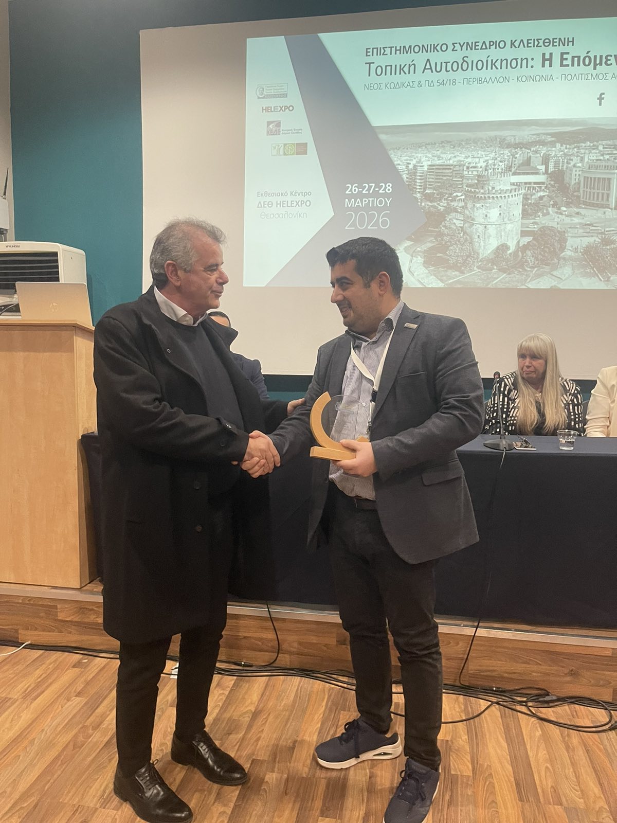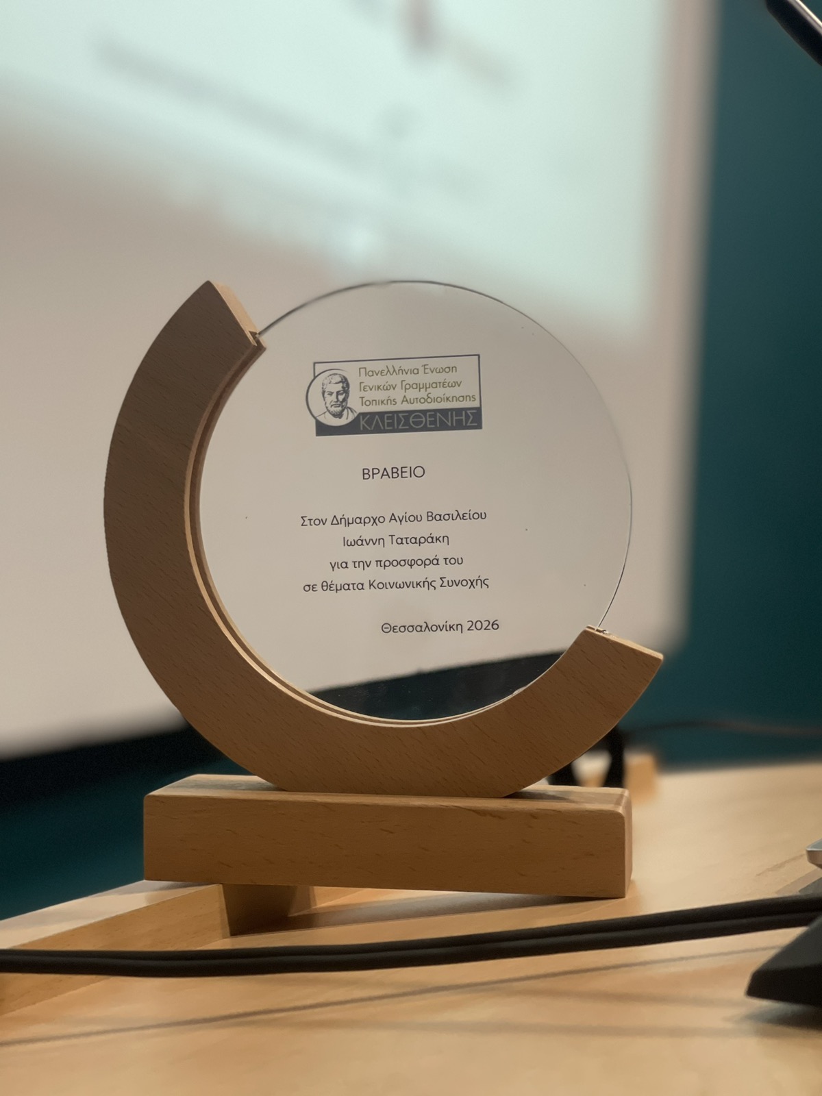 Με την ολοκλήρωση της ομιλίας του, ο Δήμαρχος Αγίου Βασιλείου τιμήθηκε με βράβευση από την Πανελλήνια Ένωση Γενικών Γραμματέων ΟΤΑ «Κλεισθένης», ως αναγνώριση της σημαντικής του προσφοράς στον τομέα της κοινωνικής συνοχής.