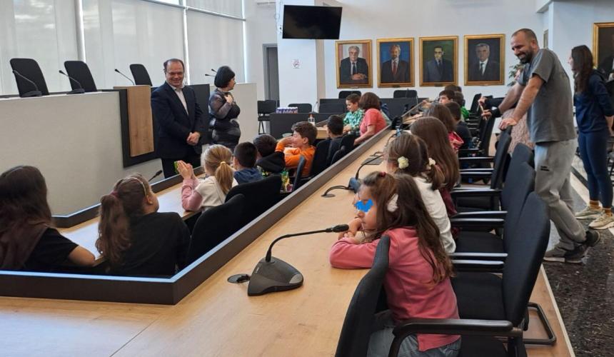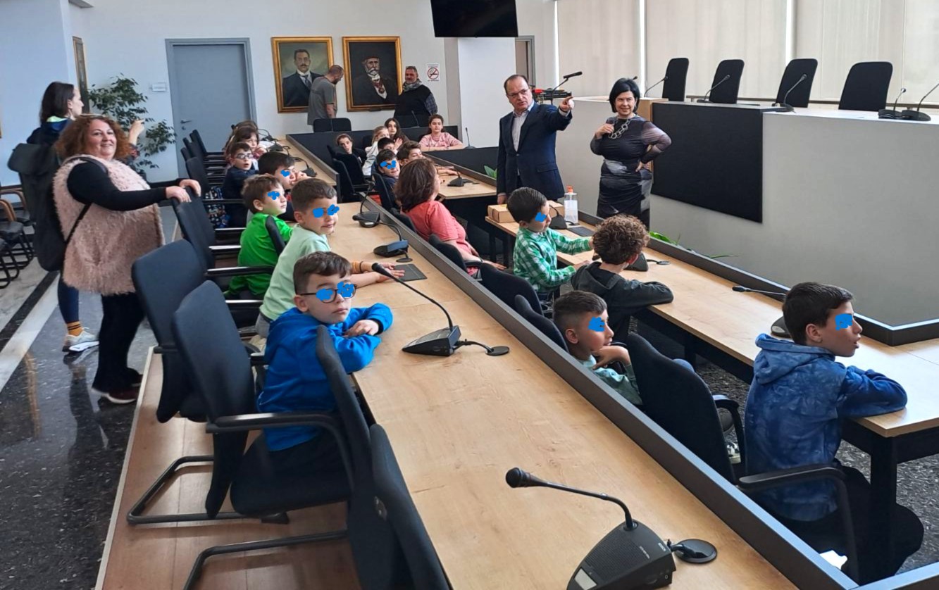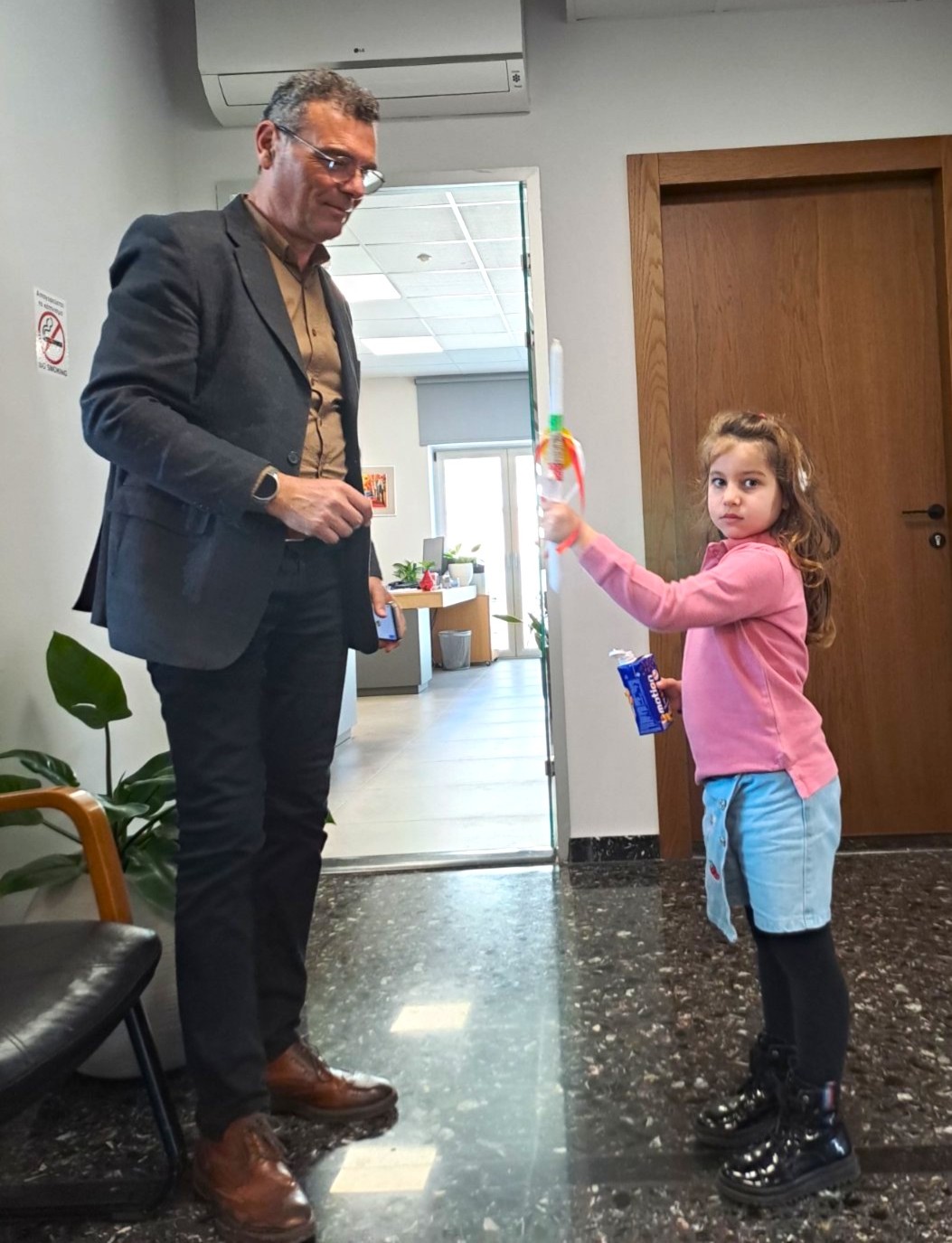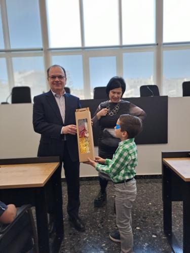 Ο Δήμαρχος και η Αντιδήμαρχος υποδέχθηκαν θερμά τα παιδιά και τους συνοδούς τους, συζήτησαν μαζί τους, αντάλλαξαν ευχές και δέχθηκαν με χαρά την καλαίσθητη πασχαλινή λαμπάδα που τους δώρισαν.