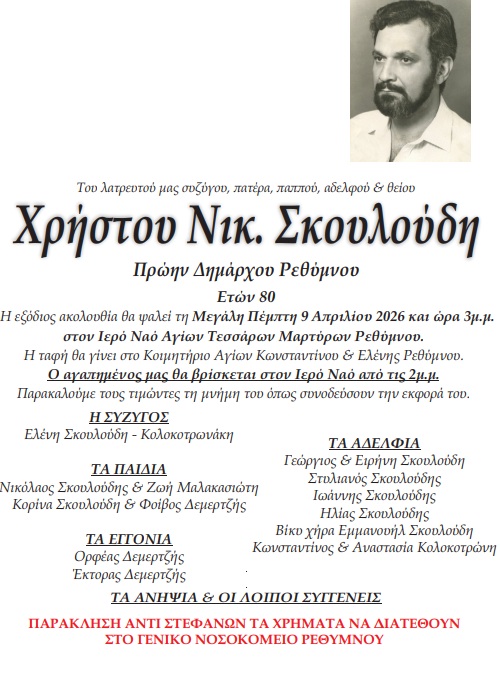 «Με βαθιά θλίψη πληροφορηθήκαμε την απώλεια του πρώην Δημάρχου Ρεθύμνης, Χρήστου Σκουλούδη, ενός ανθρώπου, που υπηρέτησε με αφοσίωση και ήθος τον τόπο μας.