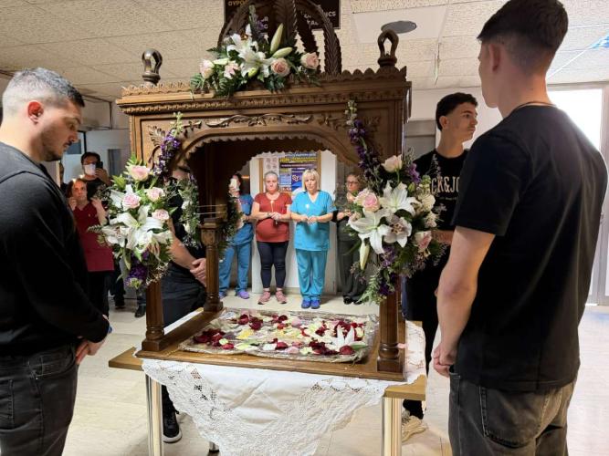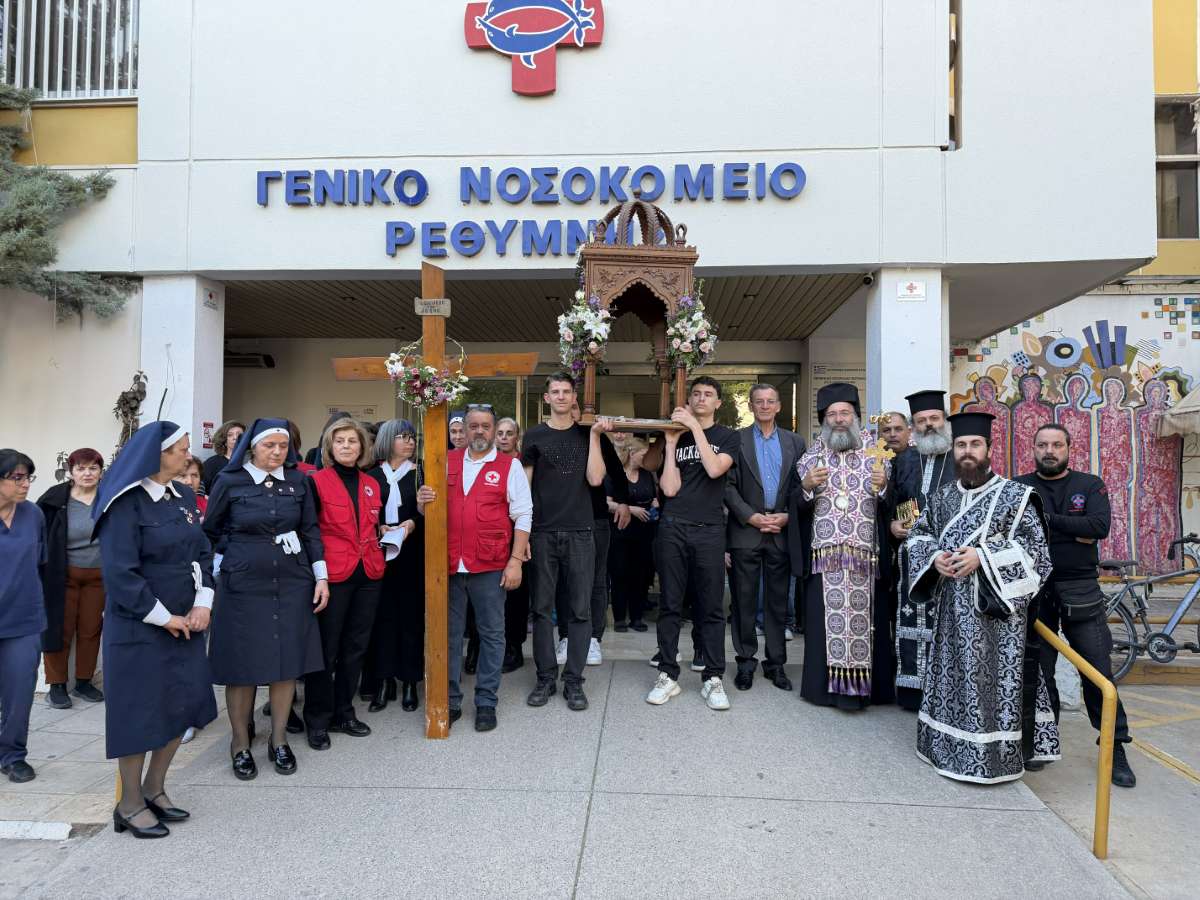 Στη συνέχεια, νωρίς το απόγευμα, ο Σεβασμιώτατος χοροστάτησε κατά την Ακολουθία του Επιταφίου Θρήνου στον Ιερό Ιδρυματικό Ναό Αγίου Λουκά Νοσοκομείου Ρεθύμνης, με την παρουσία του Διοικητού κ. Γεωργίου Παπακωνσταντή, ιατρών, νοσηλευτών, ασθενών και συνοδών τους. Ήταν συγκινητική και συνάμα επιστηρικτική η λιτάνευση του Ιερού Επιταφίου εντός του Νοσοκομείου και η διέλευσή του από όλους τους θαλάμους των ασθενών, οι οποίοι έλαβαν δύναμη και ενίσχυση προσκυνώντας τον Τίμιο Σταυρό.
