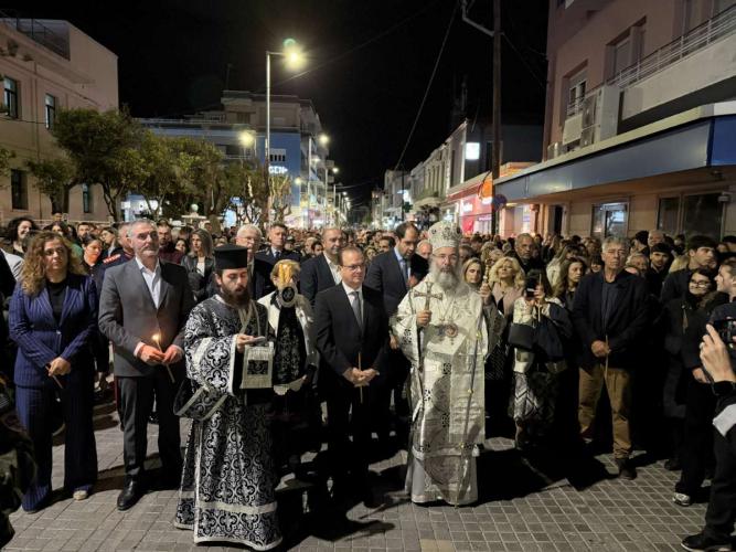 Το βράδυ της ίδιας ημέρας, ο Σεβασμιώτατος χοροστάτησε κατά την Ακολουθία του Επιταφίου Θρήνου στον Ιερό Ναό Αγίων Τεσσάρων Μαρτύρων πόλεως Ρεθύμνης, με την παρουσία των Τοπικών Αρχών, εκπροσώπων φορέων και πλήθους πιστών, οι οποίοι κατέκλυσαν το εσωτερικό του Ναού και την Πλατεία των Αγίων Τεσσάρων Μαρτύρων, στην οποία πραγματοποιήθηκε η συνάντηση των Επιταφίων των Ιερών Ναών Αγίας Μεγαλομάρτυρος Βαρβάρας, Πολιούχου Ρεθύμνης, Αγίων Κωνσταντίνου και Ελένης και Κυρίας των Αγγέλων. Εφέτος ιδιαίτερη υπήρξε η συμμετοχή ενός «παιδικού» Επιταφίου, έργου των χειρών των μικρών μαθητριών και μαθητών του 4ου Νηπιαγωγείου Ρεθύμνου με την καθοδήγηση των νηπιαγωγών τους.
