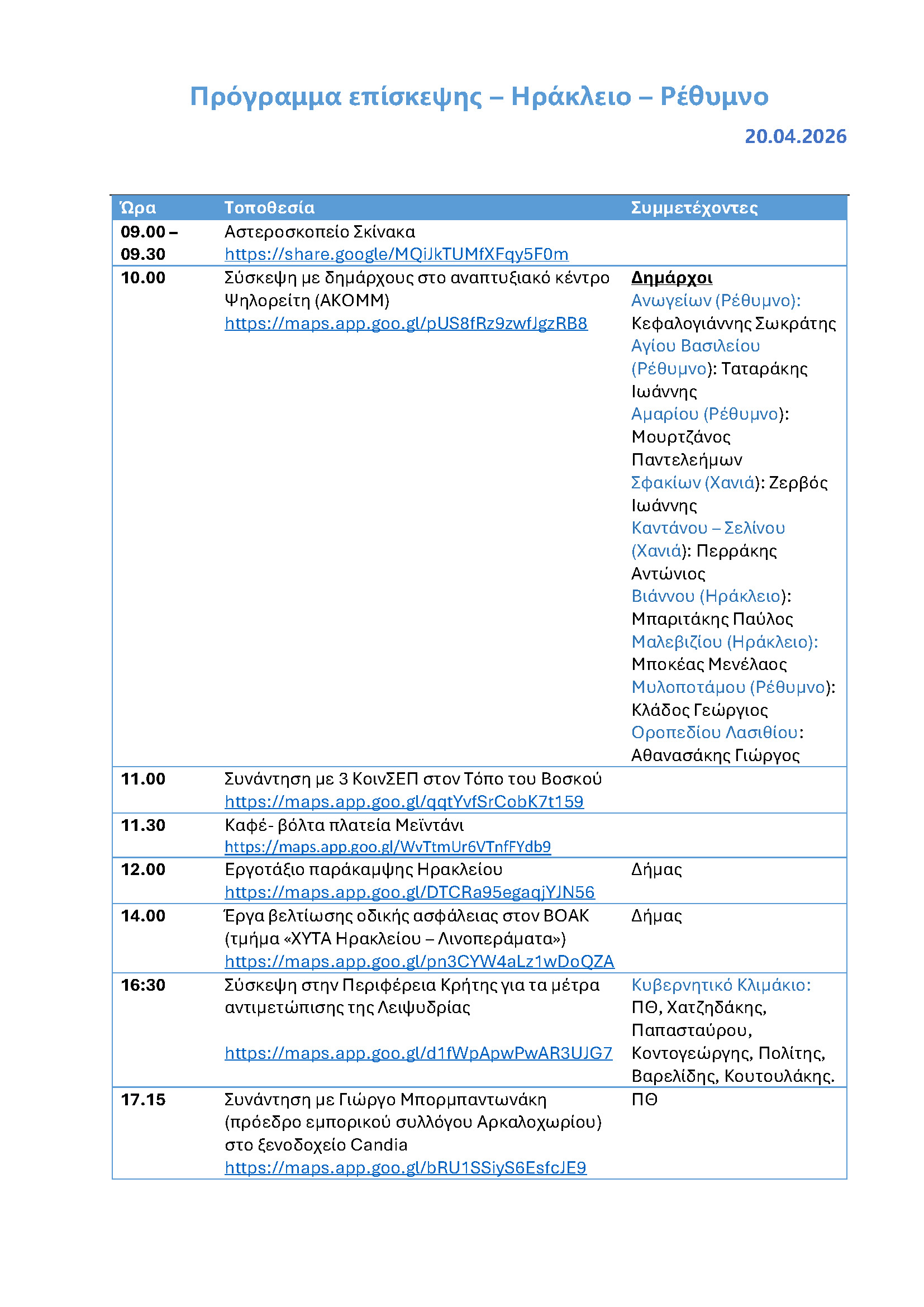 - 10.00: Σύσκεψη στο Αναπτυξιακό Κέντρο Ψηλορείτη (ΑΚΟΜΜ) για τη στρατηγική για τις ορεινές περιοχές και τη νέα Ειδική Γραμματεία Ορεινών Περιοχών με τον δήμαρχο Ανωγείων και Προέδρο του Δικτύου Ορεινών Δήμων, Σ. Κεφαλογιάννη, καθώς και με δημάρχους και εκπροσώπους των δήμων Αγίου Βασιλείου, Αμαρίου, Σφακίων, Καντάνου – Σελίνου, Βιάννου, Οροπέδιου Λασιθίου, Μαλεβιζίου και Μυλοποτάμου.