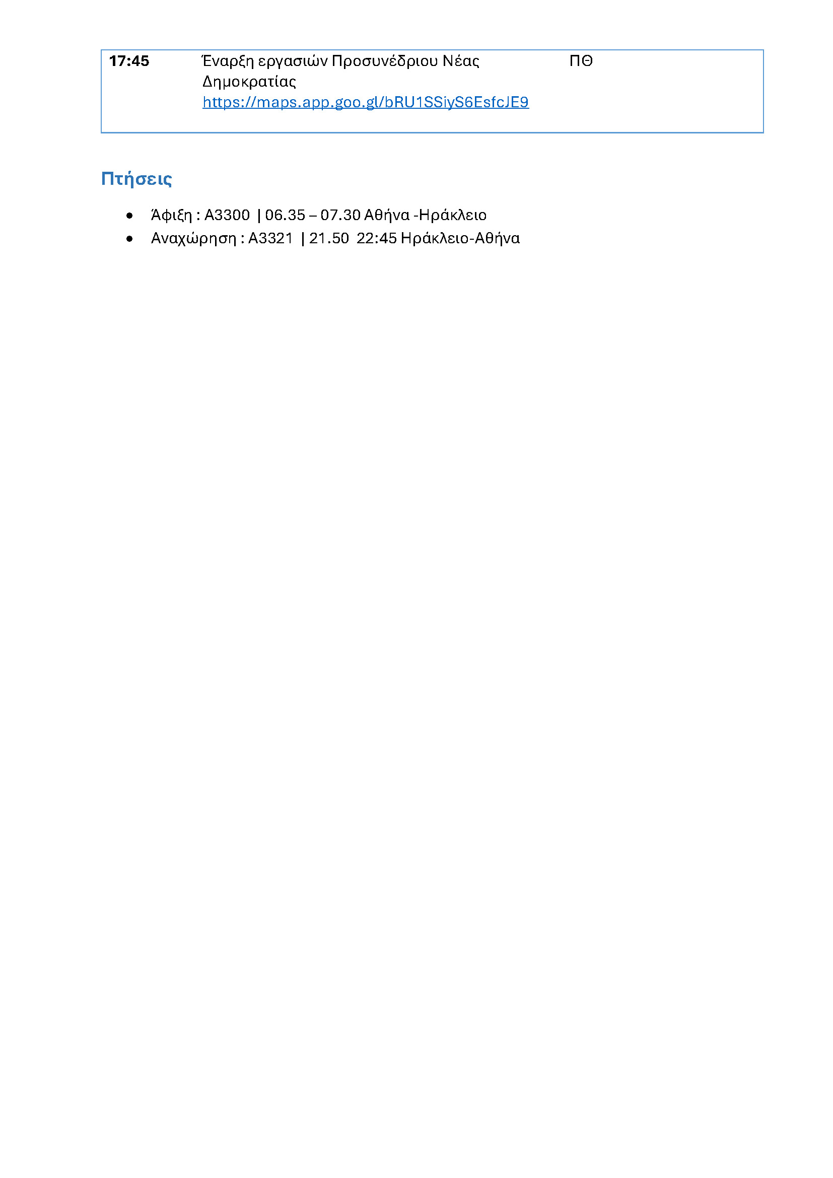 - 17.45: Συμμετοχή στο Προσυνέδριο της Νέας Δημοκρατίας στο Ηράκλειο.