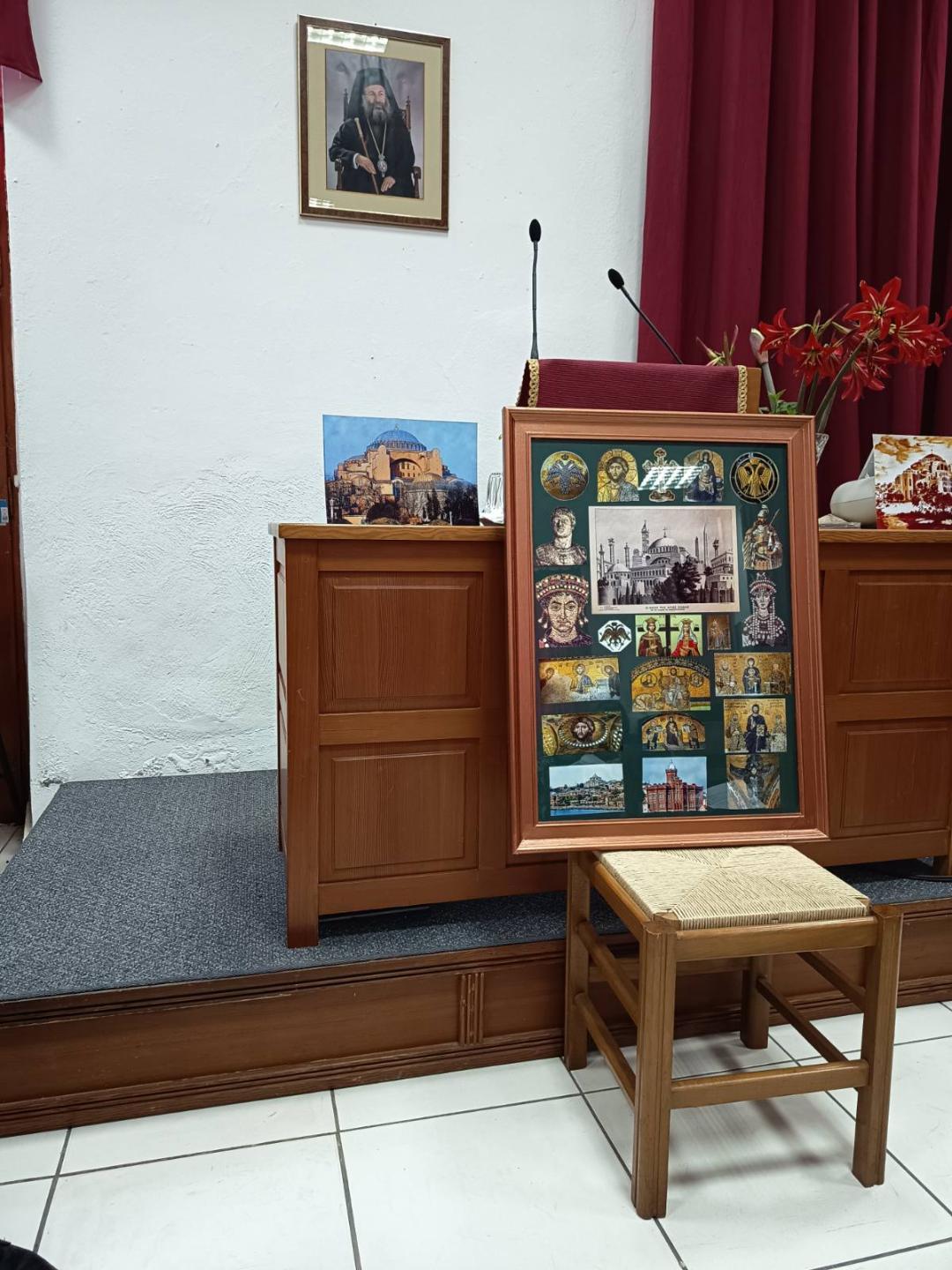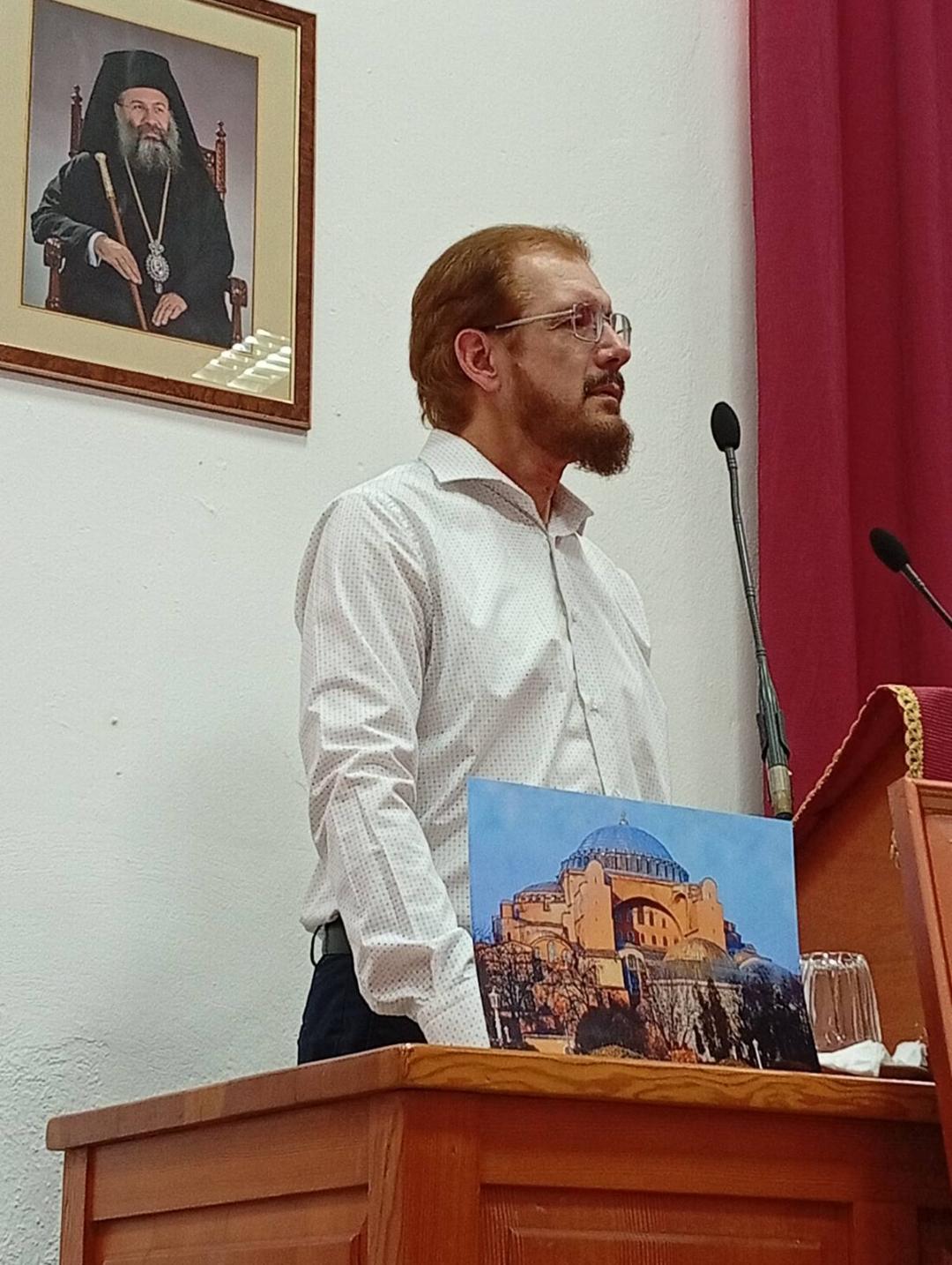 Ο ομιλητής, μας ταξίδεψε στην υπέρτατη τέχνη, μέσω ενός μεγάλου κάδρου που είχε φτιάξει για την περίσταση, στο οποίο είχε τοποθετήσει μεταξύ άλλων ένα αντίγραφο παλαιάς λιθογραφίας, που απεικόνιζε την Αγιά Σοφιά τη βυζαντινή, την ορθόδοξη, με τον σταυρό και το περίφημο καμπαναριό και οβελίσκους της , πριν τη βεβηλώσουν οι Τούρκοι και υψώσουν τους μιναρέδες και την ημισέληνο που καταστρέφουν την αρμονία και την αμαυρώνουν. Στο κάδρο αυτό προβάλλονταν θαυμάσιες φωτογραφίες του υπέρλαμπρου ναού από το εξωτερικό και το εσωτερικό του, τα μοναδικά ψηφιδωτά και τον τέλειο τρούλο που φαίνεται να αιωρείται με τα σαράντα παράθυρά του, τα οποία δίδουν την αίσθηση της παρουσίας του θεού και του ουράνιου θόλου. Παράλληλα με την παρουσίαση του κάδρου εξήγησε στο κοινό ότι η Αγία Σοφία είναι από πλευράς αρχιτεκτονικής το σύμβολο της ένωσης του Ελληνισμού με τον Χριστιανισμό, δεδομένου ότι σε αυτόν τον ναό οι Έλληνες αρχιτέκτονες από την Μικρά Ασία, Ανθέμιος και Ισίδωρος ένωσαν τον τύπο του ορθογώνιου ή τετράγωνου ναού με τα περίκεντρα κτίρια δημιουργώντας την ‘’ Βασιλική με τρούλο’’, υιοθετώντας παράλληλα στοιχεία της αρχαιοελληνικής αρχιτεκτονικής και τέχνης με στοιχεία και σύμβολα της Ανατολής και της Χριστιανοσύνης. Τέλος ο κ. Τσουπάκης έδωσε στο ακροατήριο φωτοτυπίες που περιείχαν ετυμολογία βασικών ελληνικών λέξεων, που ο Χριστιανισμός (και τα τριών δογμάτων) πήρε από τον Ελληνισμό, δεδομένου ότι το όχημα της παγκόσμιας διάδοσης της θρησκείας του Θεανθρώπου ήταν η μοναδική Ελληνική Γλώσσα.