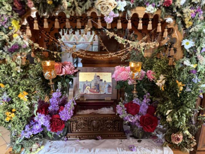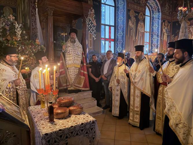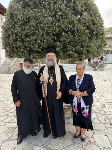 Ο Σεβασμιώτατος, στην προσλαλιά του, αναφέρθηκε στη μαρτυρία του Αγίου Μεγαλομάρτυρος Γεωργίου του Τροπαιοφόρου και ευχήθηκε καταλλήλως προς τους πολυπληθείς προσκυνητές και τον άγιο Καθηγούμενο της Μονής.