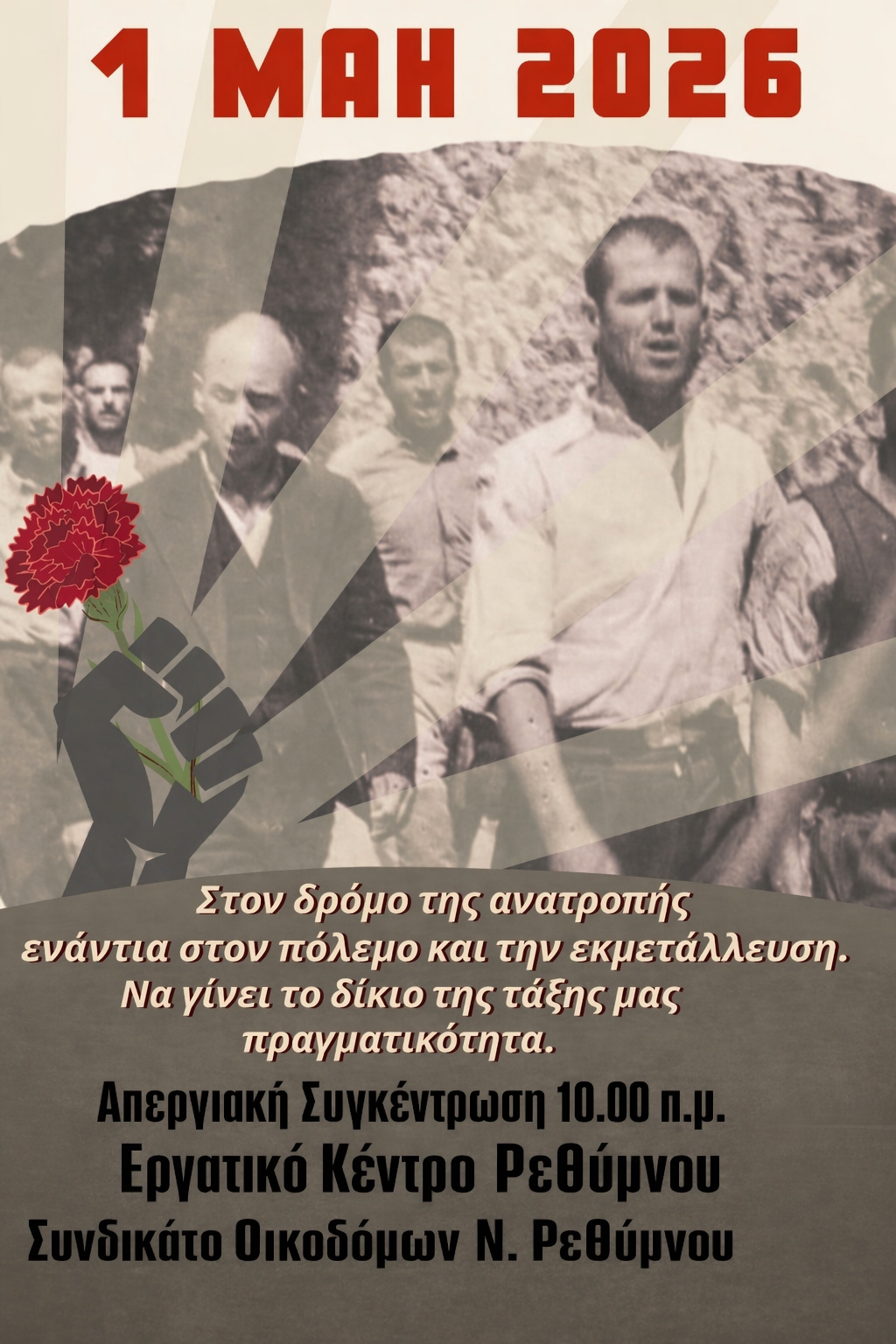 Την 1η Μάη του 2026 πιάνουμε το κόκκινο νήμα που συνδέει τους αγώνες της τάξης μας για “έναν κόσμο στο μπόι των ονείρων και των ανθρώπων”. Βαδίζουμε στον δρόμο της ανατροπής που χάραξαν οι ήρωες και πρωτοπόροι της ταξικής πάλης, από τους εργάτες του Σικάγο του 1886 μέχρι τους 200 κομμουνιστές που εκτελέστηκαν στην Καισαριανή την Πρωτομαγιά του 1944.
