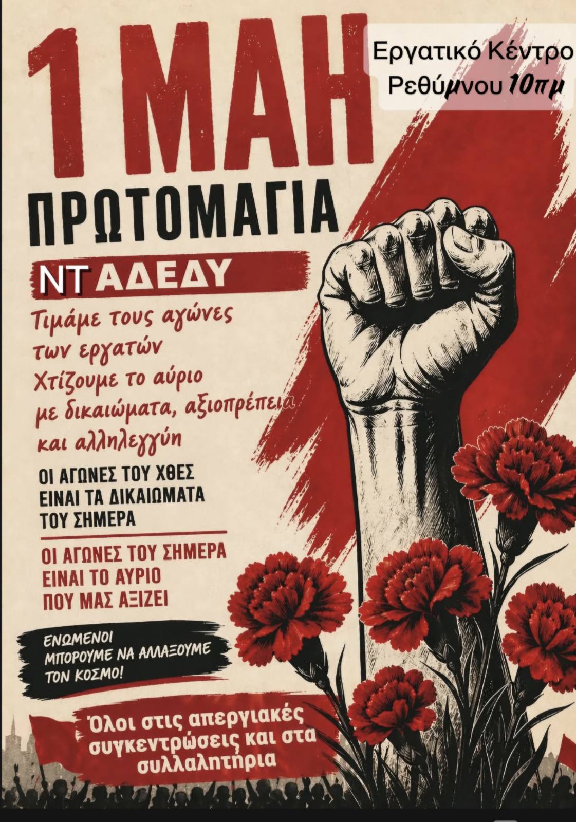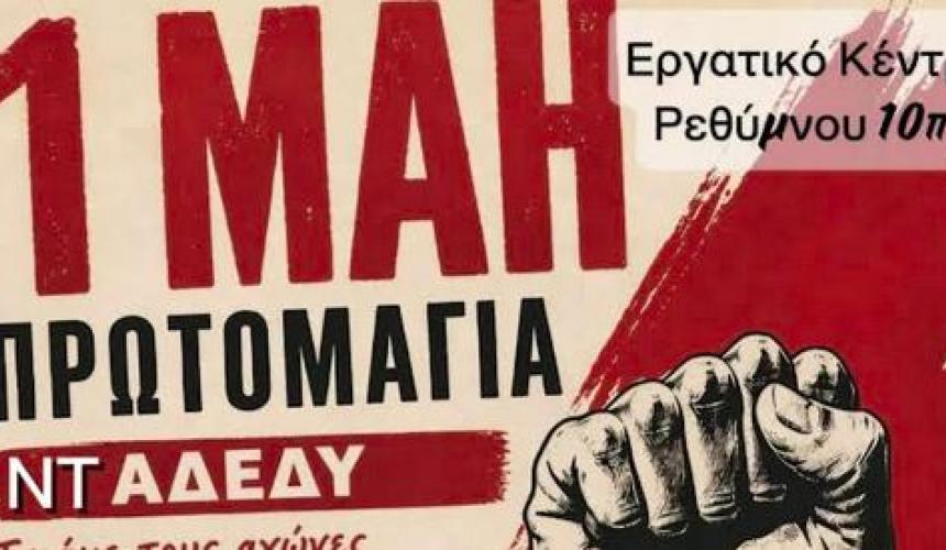 Τo Ν.Τ. ΑΔΕΔΥ Ρεθύμνου καλεί σωματεία, εργαζόμενους/ες στον δημόσιο και ιδιωτικό τομέα, φορείς, πολίτες την Παρασκευή 1/5/2026 και ώρα 10.00 π.μ. σε συγκέντρωση στο Εργατικό Κέντρο Ρεθύμνου.