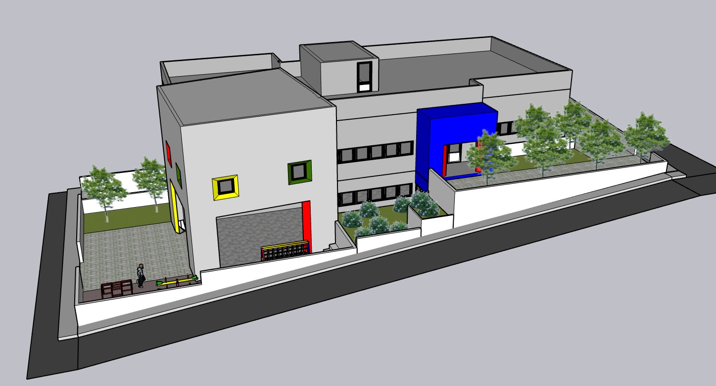 Ο αύλειος χώρος θα είναι περιφραγμένος, διαμορφωμένος με εστίες πρασίνου και κατάλληλα για τα παιδιά παιχνίδια, ενώ ένα τμήμα του θα είναι στεγασμένο ώστε να επιτρέπει το παιχνίδι σε όλες τις καιρικές συνθήκες.