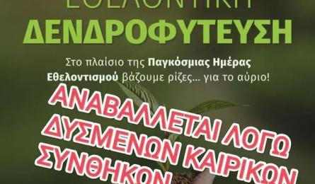 Ρέθυμνο: Αναβάλλεται, λόγω καιρού, η εθελοντική δενδροφύτευση στον κόμβο Ατσιποπούλου Ο Δήμος Ρεθύμνης ενημερώνει ότι λόγω δυσμενών καιρικών συνθηκών αναβάλλεται η εκδήλωση της Εθελοντικής Δενδροφύτευσης που επρόκειτο να... 05.12.2025 14:31
