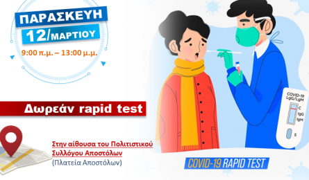 Κορωνοϊός: πρόσκληση για rapid test στους δημότες του Δήμου Αμαρίου Νέα πρόσκληση συμμετοχής απευθύνει προς τους δημότες του ο Δήμος Αμαρίου για να κάνουν rapid tests για τον κορωνοϊό την προσεχή Παρασκευή 12 Μαρτίου.... 09.03.2021 12:33