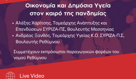 Διαδικτυακή εκδήλωση του ΣΥΡΙΖΑ-ΠΣ Ρεθύμνου για την Οικονομία και την Δημόσια Υγεία την Δευτέρα 21/12 με Αλέξη Χαρίτση και Ανδρέα Ξανθό Η Νομαρχιακή Επιτροπή Ρεθύμνου του ΣΥΡΙΖΑ-Προοδευτική Συμμαχία διοργανώνει την Δευτέρα 21/12/2020 στις 7 μμ ζωντανή διαδικτυακή εκδήλωση-συζήτηση... 21.12.2020 13:20