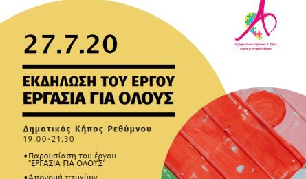 Ενημερωτική εκδήλωση του έργου: ΕΡΓΑΣΙΑ ΓΙΑ ΟΛΟΥΣ με στόχο την εργασιακή Ένταξη των ΑμεΑ Ο Σύλλογος γονέων κηδεμόνων και φίλων ατόμων με αυτισμό Ρεθύμνου, τη Δευτέρα 27 Ιουλίου θα πραγματοποιήσει την ενημερωτική εκδήλωση του έργου... 20.07.2020 12:21