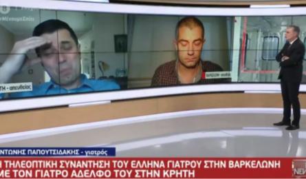 Κορονοϊός – Συγκλονιστική στιγμή: Ρεθυμνιώτης γιατρός “συναντά” τον γιατρό αδερφό του στη Βαρκελώνη και λυγίζει “Λύγισαν” τα δύο αδέρφια, όταν συναντήθηκαν τηλεοπτικά στην εκπομπή “Live News” του Νίκου Ευαγγελάτου στο Mega. Ο Βαγγέλης Παπουτσιδάκης “μάχεται”... 25.03.2020 19:48