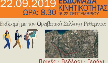 Ρέθυμνο: Φυσιολατρική εκδρομή σε Πρινέ - Βεδέρους - Γεράνι Την ερχόμενη Κυριακή 22 Σεπτεμβρίου 2019, ο Δήμος Ρεθύμνης σε συνεργασία με τον Ορειβατικό Σύλλογο Ρεθύμνου διοργανώνουν τη δράση «Περπάτημα στη... 16.09.2019 15:04