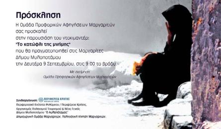Ρέθυμνο: Η ομάδα προφορικών αφηγήσεων μας καλεί στις Μαργαρίτες Στις 9 Σεπτεμβρίου, 9 το βράδυ, στην Πλατεία της Κατωχωριάς στις Μαργαρίτες Ρεθύμνου, η Ομάδα Προφορικών Αφηγήσεων Μαργαριτών, θα παρουσιάζει το... 06.09.2019 14:05
