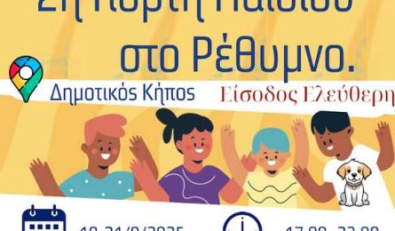 2η Γιορτή Παιδιού: Παρασκευή 19 Σεπτεμβρίου έως και την Κυριακή 21 Σεπτεμβρίου στον Δημοτικό Κήπο Ρεθύμνου «Το Χαμόγελο του Παιδιού» σε συνεργασία με το Παιδαγωγικό Τμήμα Δ.Ε | Ε.ΔΙ.Β.Ε.Α του Πανεπιστημίου Κρήτης, σας προσκαλούν στη 2η Γιορτή... 18.09.2025 12:55