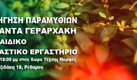 Αφήγηση Παραμυθιών από την Αμάντα Γεραρχάκη & Παιδικό εικαστικό εργαστήριο Στο πλαίσιο της εικαστικής φιλοξενίας 'Plakias Art Residency 2019' θα πραγματοποιηθούν δύο μέρες με αφήγηση παραμυθιών από την Αμάντα Γεραρχάκη και... 11.03.2019 13:37