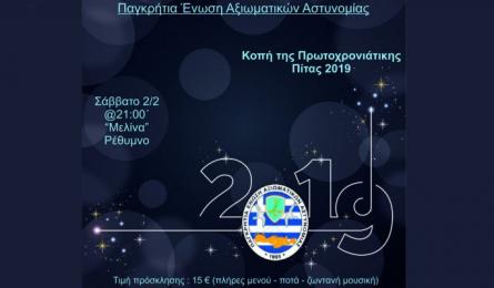 Ρέθυμνο: Στις 2 Φεβρουαρίου η κοπή της πίτας της Ένωσης Αξιωματικών ΕΛΑΣ Κρήτης Στο Ρέθυμνο η κοπή της πίτας με πλήρες μενού, ποτά και ζωντανή μουσική Το Σάββατο 2 Φεβρουαρίου 2019 και ώρα 21:00΄ θα κόψει η Παγκρήτια Ένωση... 30.01.2019 11:06