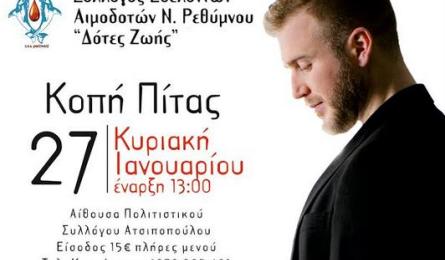 Κοπή πρωτοχρονιάτικης πίτας του Συλλόγου Αιμοδοτών «Δότες Ζωής» Ο Σύλλογος Εθελοντών Αιμοδοτών Ν. Ρεθύμνου "Δότες Ζωής" σας προσκαλεί στην εκδήλωση κοπής της πρωτοχρονιάτικης πίτας που θα γίνει στην αίθουσα του... 23.01.2019 12:44