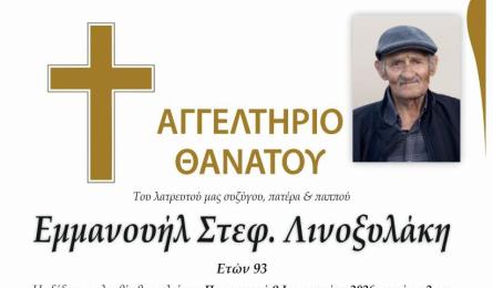 Ρέθυμνο: Ένας κύκλος ζωής 93 ετών κλείνει - Θλίψη για την απώλεια του Μανώλη Λινοξυλάκη Το Άνω Μέρος Αμαρίου Ρεθύμνου αποχαιρετά την Παρασκευή 9 Ιανουαρίου τον Μανώλη Λινοξυλάκη, που έφυγε από τη ζωή σε ηλικία 93 ετών Στις 2 το... 08.01.2026 14:15