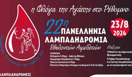 Τελετή Λήξης της 22ης Λαμπαδηδρομίας Εθελοντών Αιμοδοτών στην Πλατεία των Τεσσάρων Μαρτύρων στις 23 Αυγούστου Μέσα από τους ήχους της κρητικής λύρας θα ταξιδέψει στο Ρέθυμνο και σε όλη την Ελλάδα το μήνυμα της εθελοντικής αιμοδοσίας, το μήνυμα της προσφοράς... 20.08.2024 17:14