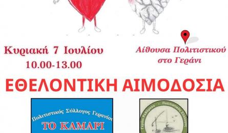 Εθελοντική αιμοδοσία στο Γεράνι την Κυριακή 2η Εθελοντική Αιμοδοσία για το έτος 2024 από τον Πολιτιστικό Σύλλογο Γερανίου «ΤΟ ΚΑΜΑΡΙ», μέλος Δικτύου του ΣΕΑ Ν. Ρεθύμνης... 03.07.2024 22:54