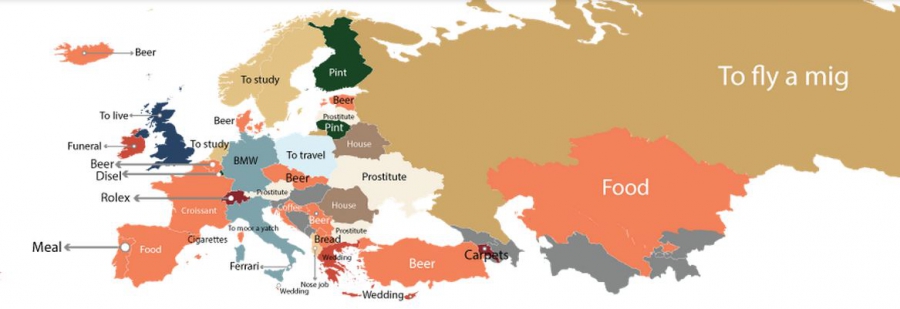 Σε αυτά τα ερωτήματα σκέφτηκαν να απαντήσουν οι διαχειριστές του ιστότοπου Fixr.com , δημιουργώντας, βάσει του ιστορικού των αναζητήσεων που πραγματοποιεί κάθε χώρα στη μηχανή αναζήτησης Google, έναν χάρτη που καταδεικνύει το δημοφιλέστερο «προϊόν» σε κάθε χώρα. Λαμβάνοντας λοιπόν υπόψη τους το ερώτημα για το κόστος του κάθε προϊόντος συμπέραναν και μας παρουσιάζουν τα παρακάτω