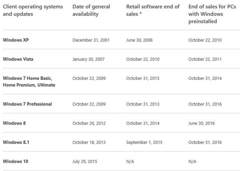 Επομένως, οι υπολογιστές με προεγκατεστημένα τα Windows 7 και τα Windows 8.1 θα πωλούνται μέχρι τις 31 Οκτωβρίου του 2016, σε αντίθεση με τους υπολογιστές με προεγκατεστημένη την έκδοση 8, οι οποίοι θα πάψουν να πωλούνται ακόμη νωρίτερα, συγκεκριμένα στις 30 Ιουνίου του 2016.